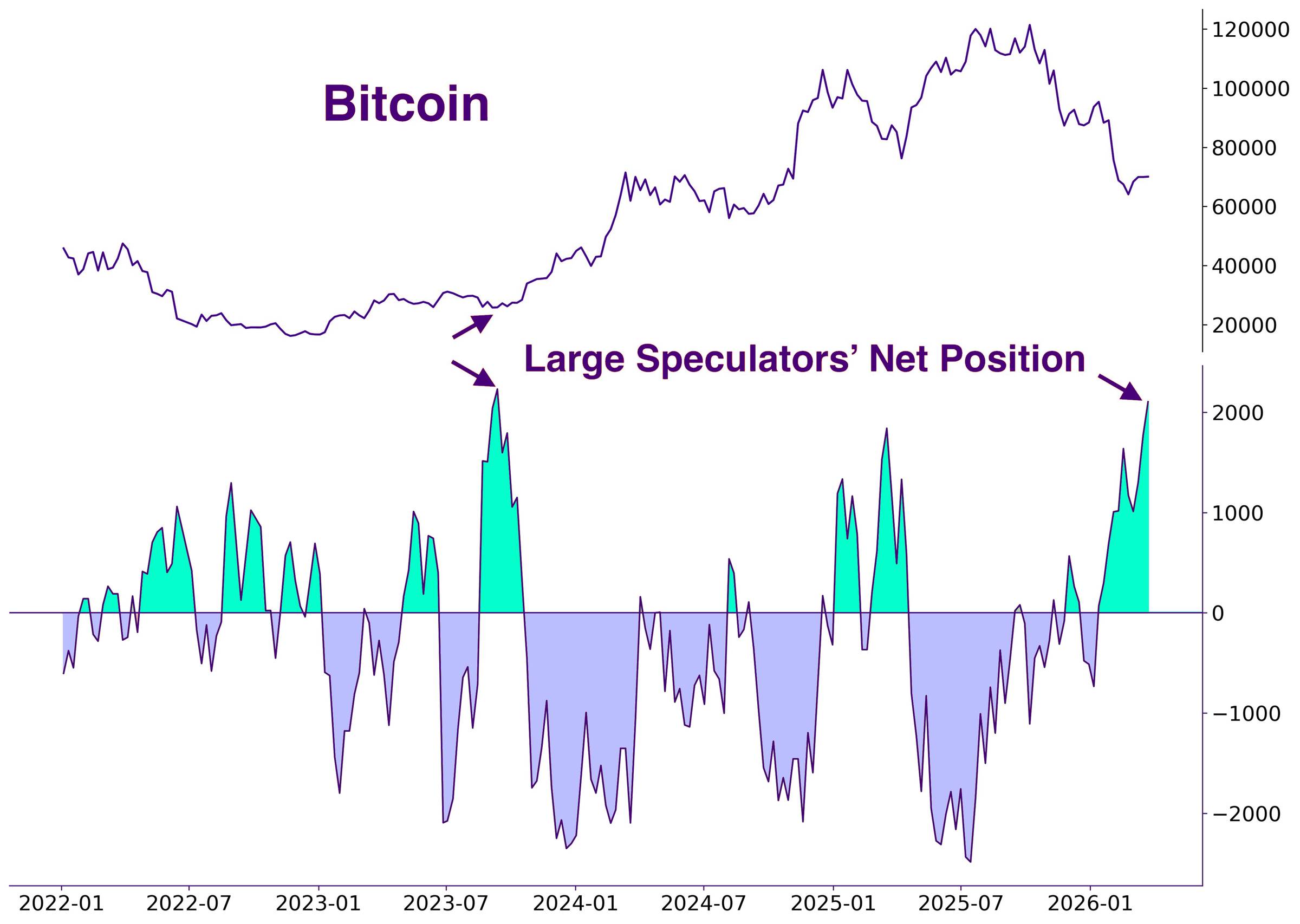 De grafiek laat zien hoe grote speculanten, denk hedge funds en professionele traders, momenteel gepositioneerd zijn in Bitcoin futures. Dit komt uit het zogeheten COT-rapport (Commitments of Traders), een wekelijkse update van de Amerikaanse toezichthouder die laat zien wie long of short zit.